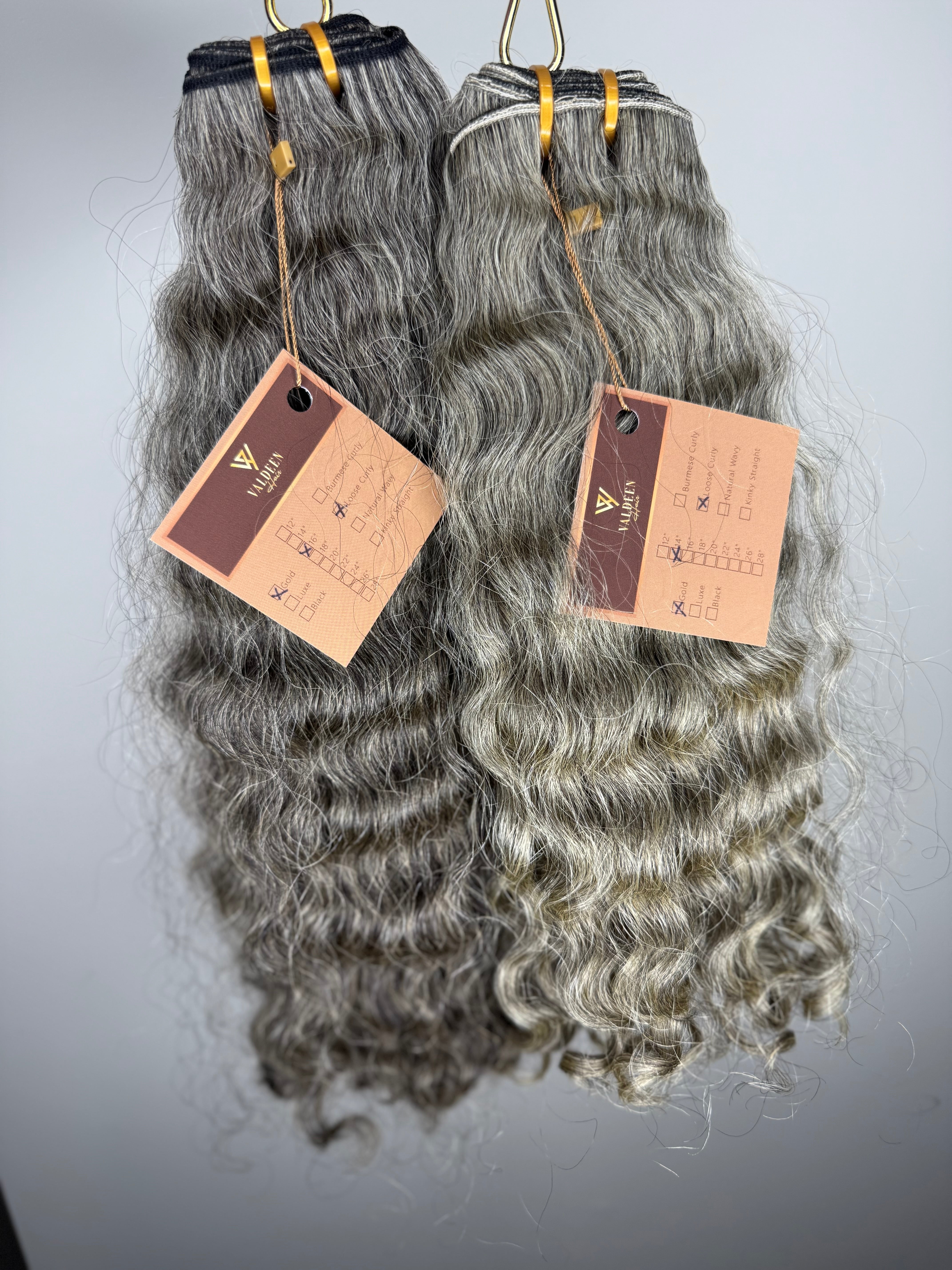This collection features naturally occurring gray and blonde extensions that have not been chemically processed. Each bundle has been cut from one single donor and is unique in color.